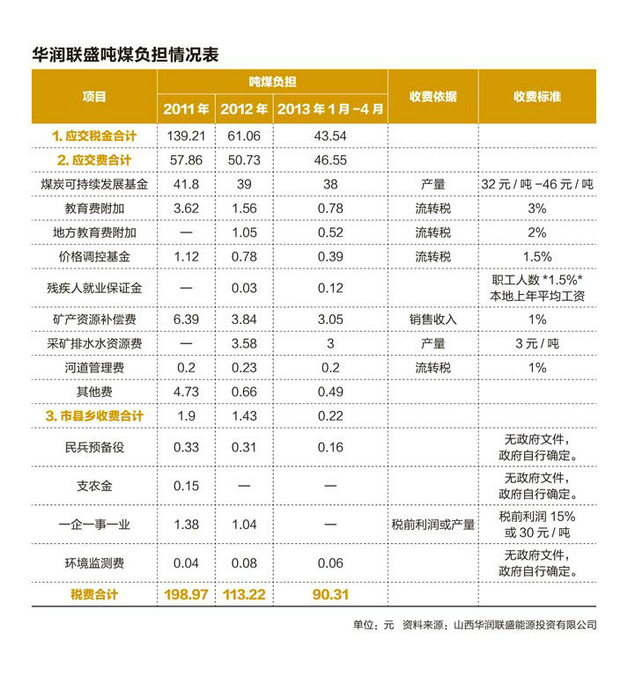 华润联盛能源投资有限公司向《财经》提供的报告显示,该公司2013年1月-4月,吨煤累计平均售价为320.21元,吨煤税费高达90.33元。该公司总经理刘荣亮介绍,华润电力在山西和江苏两省都有煤炭投资,但成本差异巨大,“吨煤成本差距在150元,原因是山西省税费沉重”。