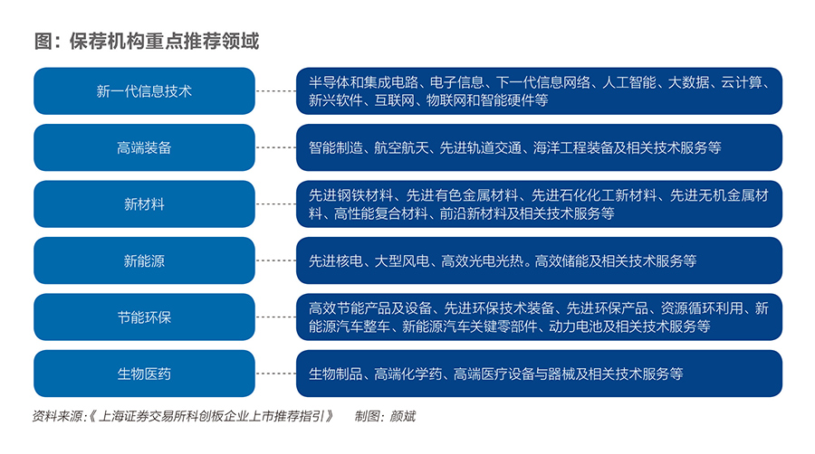 根据《科创企业上市推荐指引》,保荐机构优先推荐的企业有三类,一是符合国家战略、突破关键核心技术、市场认可度高的科技创新企业;二是属于新一代信息技术、高端装备、新材料、新能源、节能环保以及生物医药等高新技术产业和战略性新兴产业的科技创新企业;三是互联网、大数据、云计算、人工智能和制造业深度融合的科技创新企业。