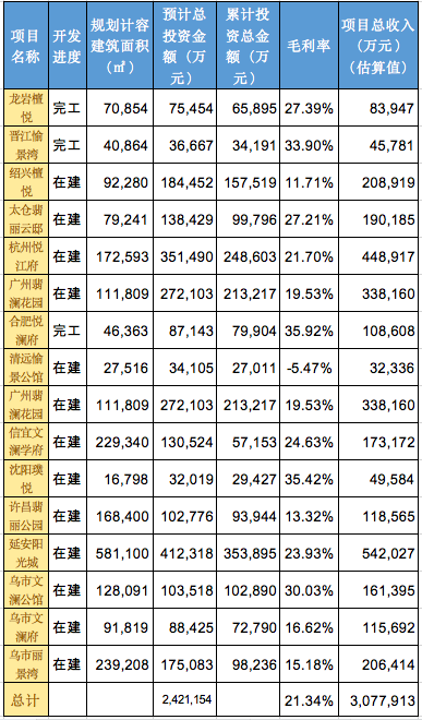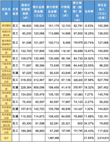 这16个项目中,毛利率超过26%的项目,只有郑州丽景公馆和景德镇翡丽公园两个项目。合并计算这16个项目,整体毛利率只为21.64%。