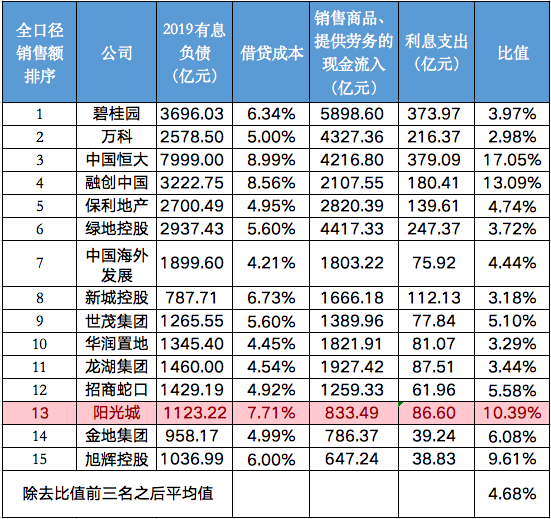 今天我们要研究的,是“地产销售十五强”(下称“十五强”)中的另一家上市公司——阳光城集团股份有限公司(000671. SZ,下称“阳光城”)。《财经》发现,阳光城2019年的利息支出与销售现金流入的比值为10.39%,在“十五强”中债务负担仅次于中国恒大和融创中国(01918.HK),排在第三。