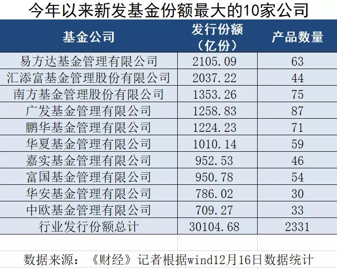 资金向头部公司汇集。数据显示,今年发行份额最多的前十大基金公司分别是易方达、汇添富、南方、广发、鹏华、华夏、嘉实、富国、华安以及中欧基金,这10家公司占领了新发基金市场超40%的份额。