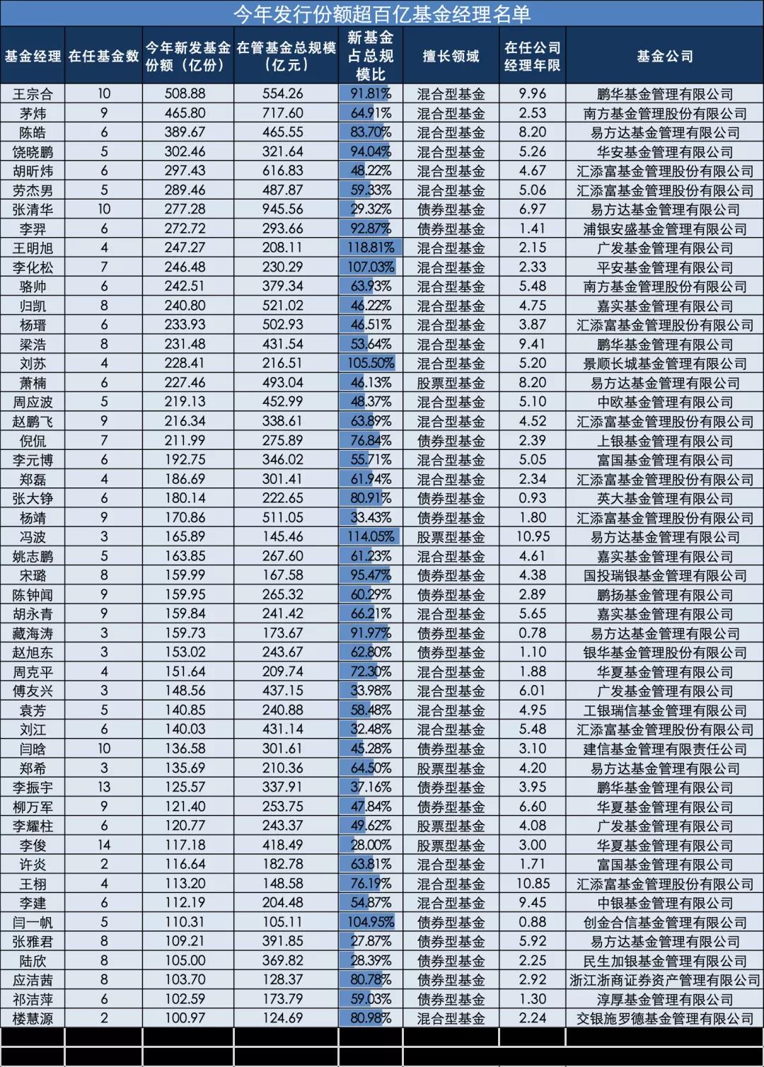一些基金经理的管理规模在今年突然爆发。从新基金占总规模比来看,10位基金经理的新发基金规模占比超过90%以上,其中6位为主动权益类基金经理,包括广发基金王明旭、易方达基金冯波、平安基金李化松、景顺长城基金刘苏、华安基金饶晓鹏、鹏华基金王宗合。