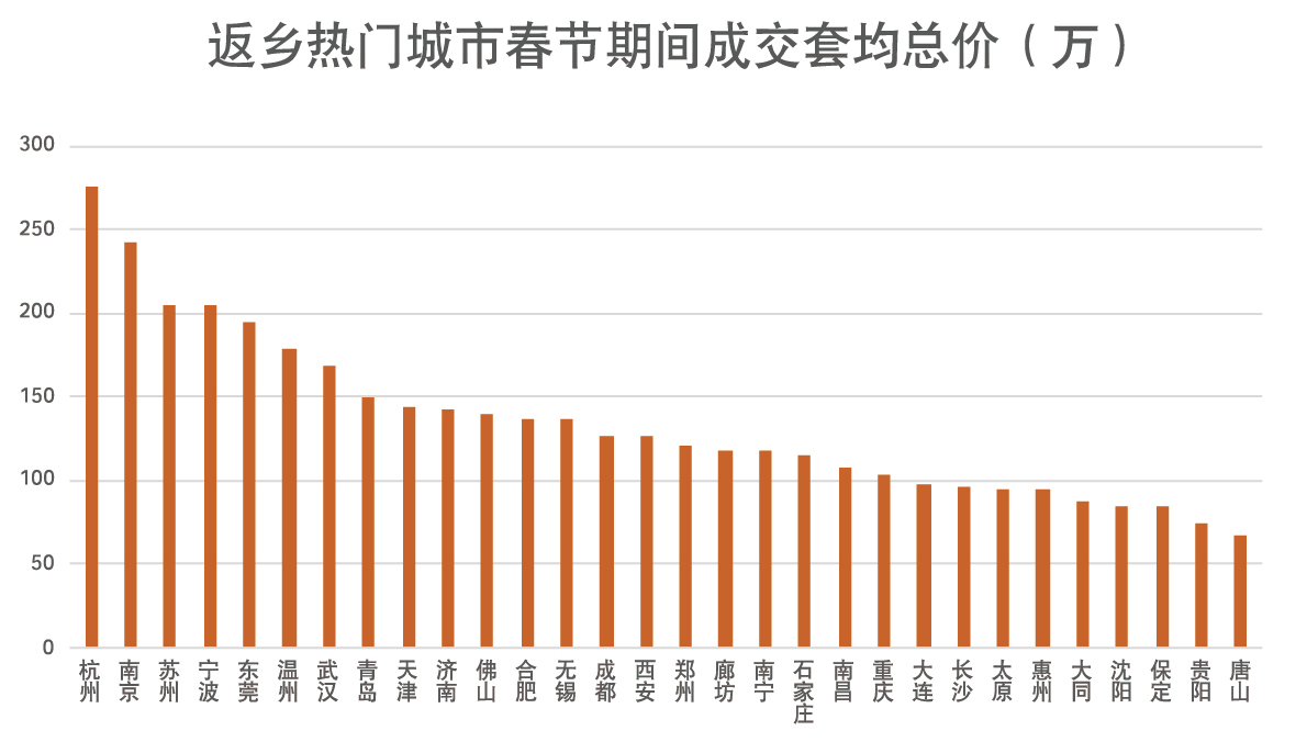 返乡置业热门城市TOP30中,21城的成交套均总价过百万,占比约为70%。其中,以杭州、南京、苏州、宁波及东莞等为代表的南方城市成交套均总价明显较高,沈阳、保定及唐山等北方城市均价相对较低,呈现出比较明显的“南高北低”现象。