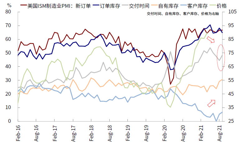 价格压力和供需矛盾近期再度成为焦点,尤其是在一些能源品上,如天然气和石油价格一度再创新高。除此之外,7~8月疫情升级也对全球供应链造成了明显扰动,这一点从美国9月制造业PMI中再度回升的交付时间,以及欧洲和部分疫情严重的新兴市场如越南和马来西亚交付时间的延长中都可以得到反应。