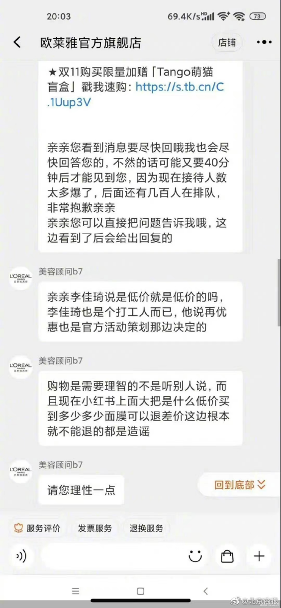 欧莱雅天猫旗舰店客服向个别消费者解释安瓶面膜退差价问题时竟然表示:“李佳琦说是低价就是低价的吗,李佳琦也是个打工人而已,他说再优惠也是官方活动策划那边决定的。”