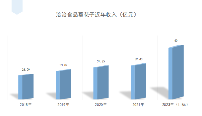 作为洽洽食品第一大收入来源,葵花子2023年的含税销售额目标为约60亿元。虽然该产品在2021年收入出现增长,但距离前述目标,还有约20亿元的差距。