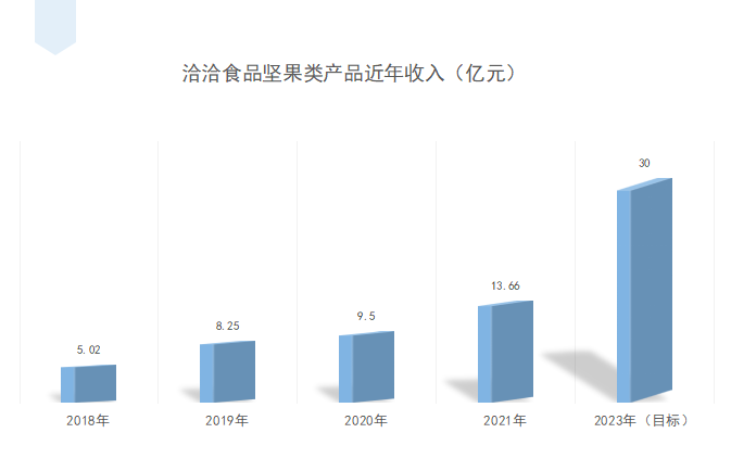 近年来,随着销售放量,坚果类产品已成为洽洽食品第二收入来源。公司在2023年百亿元营收目标(含税)规划中,确立坚果品类目标销售额约30亿元。