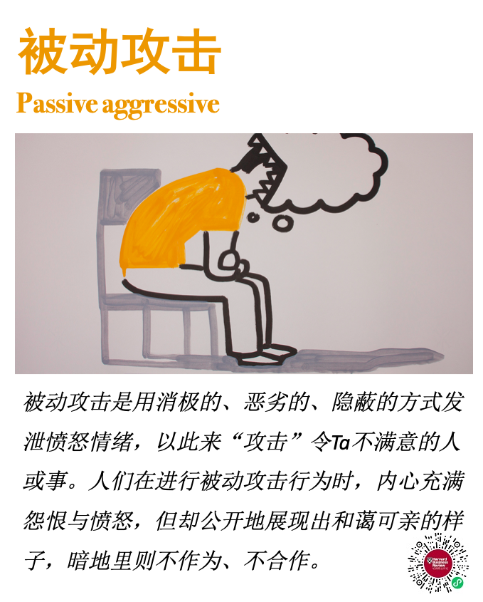 被动攻击是用消极的、恶劣的、隐蔽的方式发泄愤怒情绪,以此来“攻击”令Ta不满意的人或事。人们在进行被动攻击行为时,内心充满怨恨与愤怒,但却公开地展现出和蔼可亲的样子,暗地里则不作为、不合作。