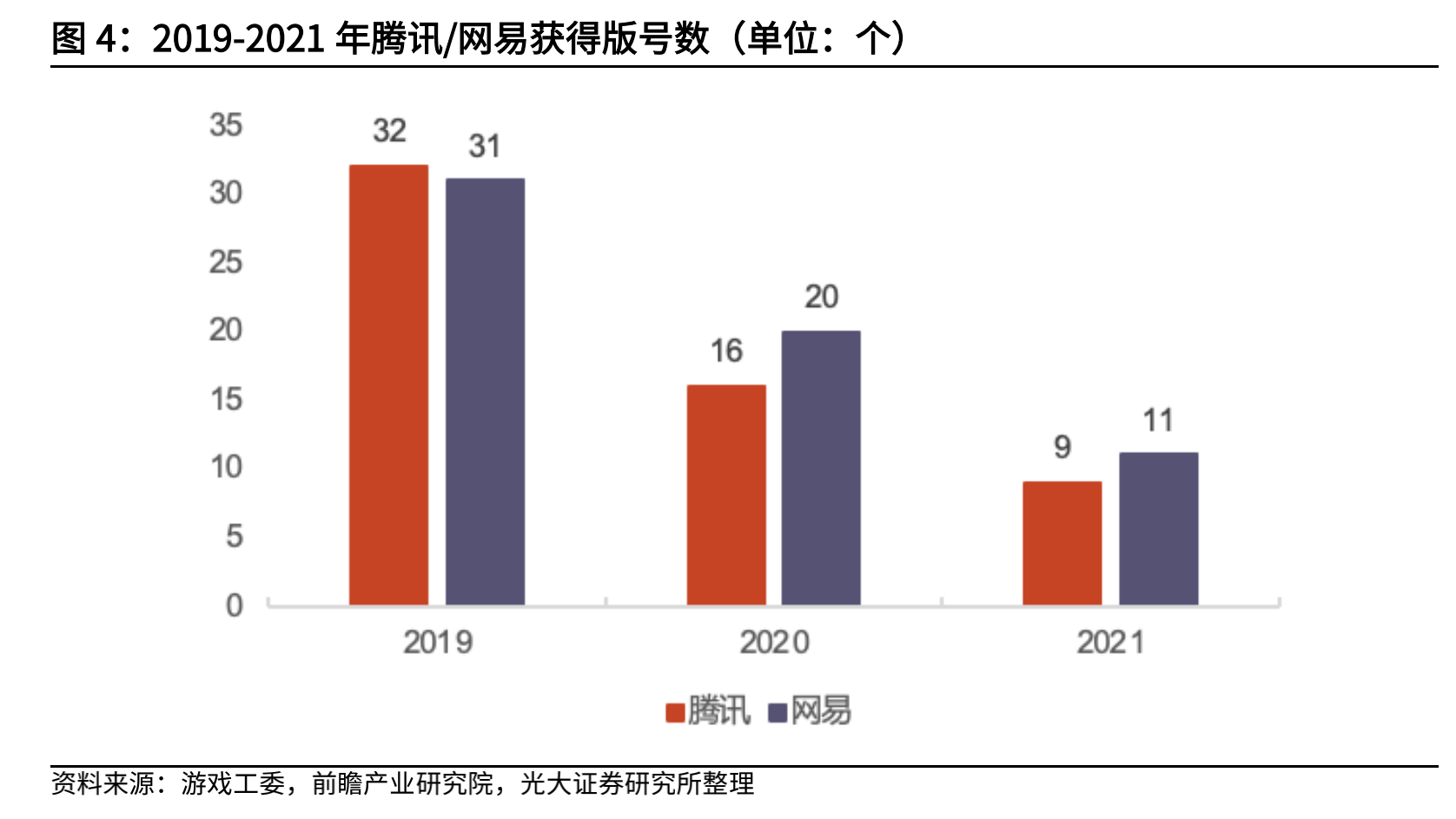 当整个行业都勒紧裤腰带时,版号库存量大的头部游戏公司“强者恒强”。2019-2021 年,腾讯分别获得 32/16/9 个版号。且在 2021 年的 9 款过审游戏中,7 款来自进口,知名度普遍较高,如《英雄联盟手游》《哆啦 A 梦牧场物语》,国内原生游戏仅有 2 款。网易的情形与此类似。