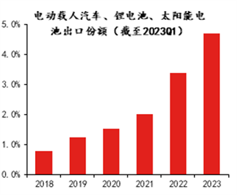随着全球对新能源、绿色低碳领域的重视程度提高,我国新能源产品出口亦呈现高速增长。一季度我国电动载人汽车、锂电池、太阳能电池(俗称“新三样”)合计出口2646.9亿元,同比增长66.9%,拉高了出口增速2个百分点,且占我国出口比重达到4.7%。据估算,2018年以上三种品类占出口比重不及1%,2020年这一比重也只有1.5%左右。也就是说,伴随数字化、绿色化大趋势,我国新能源产品出口“从零开始”实现了非常亮眼的增长,凸显出我国在相关领域处于领先地位。