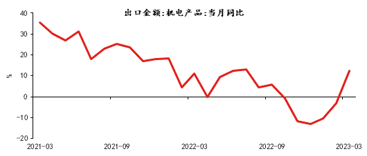 3月机电产品出口继续改善,同比增速由1月-2月的-7.2%回升至12.3%,拉动出口增速上涨7.2个百分点。多年来,机电产品一直是中国出口的基本盘。截至一季度,机电产品出口份额依然保持在57.9%的高位。其中,汽车和新能源产品表现尤为抢眼。