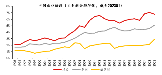图表 4 近年来,拉美、非洲、俄罗斯出口份额均有上升