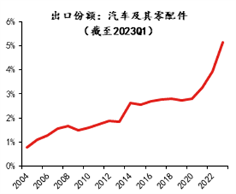 近年来我国汽车产业链日益完备、自主品牌不断成长,汽车相关出口表现强势。3月汽车(包括底盘)出口增速高达123.8%,整个一季度累计同比增长81.6%,延续了2022年以来的增长势头。3月汽车零配件出口增速也达到25.3%。从出口占比看,一季度汽车及其零配件占总体出口的比重快速提升至5.1%,而2019年和2022年这一占比仅为2.7%和3.9%。
