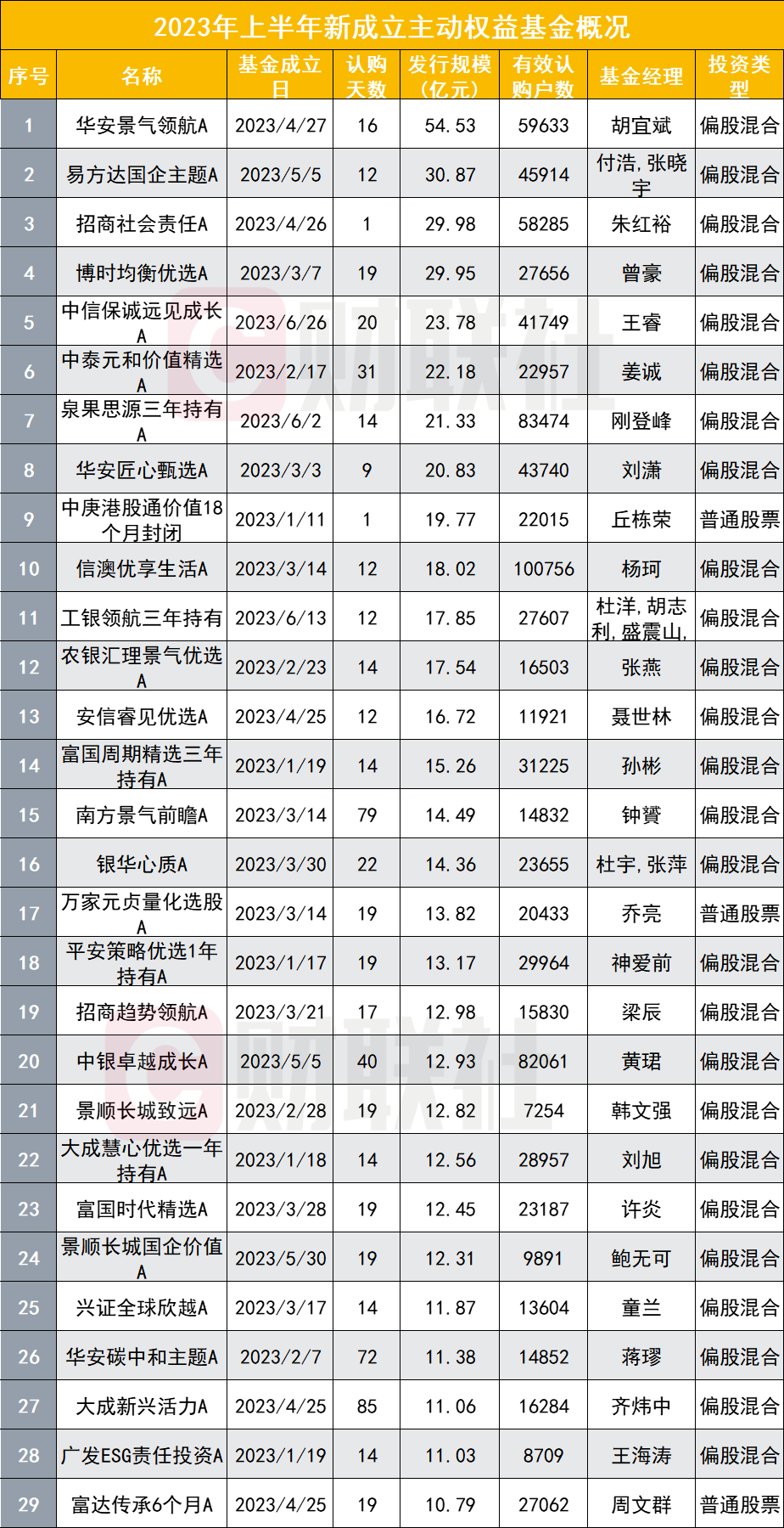 招商社会责任、博时均衡优选、中信保诚远见成长、中泰元和价值精选、泉果思源三年持有、华安匠心甄选,这6只产品今年的发行规模也超过了20亿元。