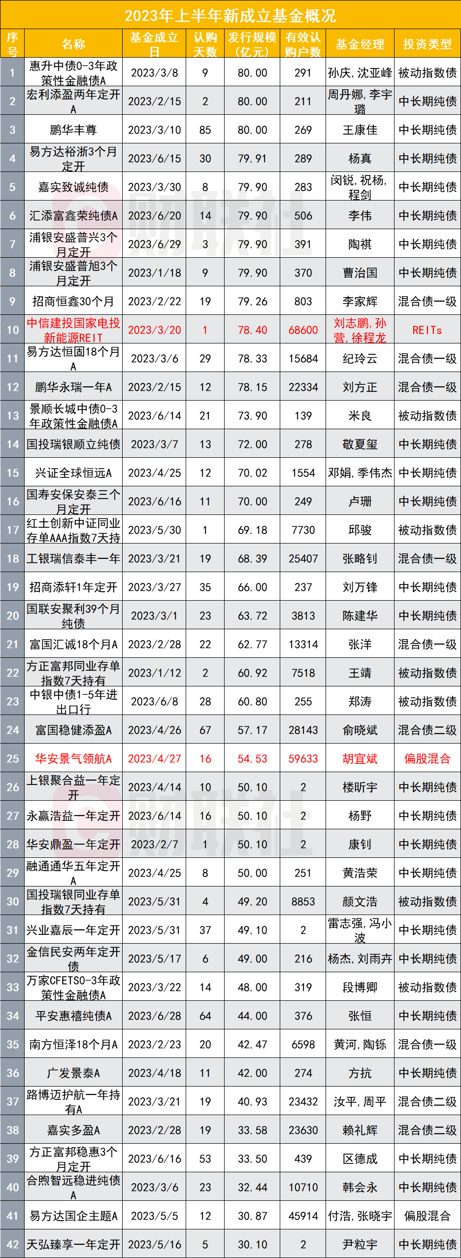 在年内新成立的所有基金中,仅有一只REITs和一只主动权益基金入围发行规模榜单前四十,其余38只产品均为债券类基金,22只债基发行规模超过60亿元,华安景气领航则以54.53亿元的发行规模位居上半年新成立基金发行规模榜单第25位。该产品外,仅有7只主动权益产品发行规模超过20亿元。