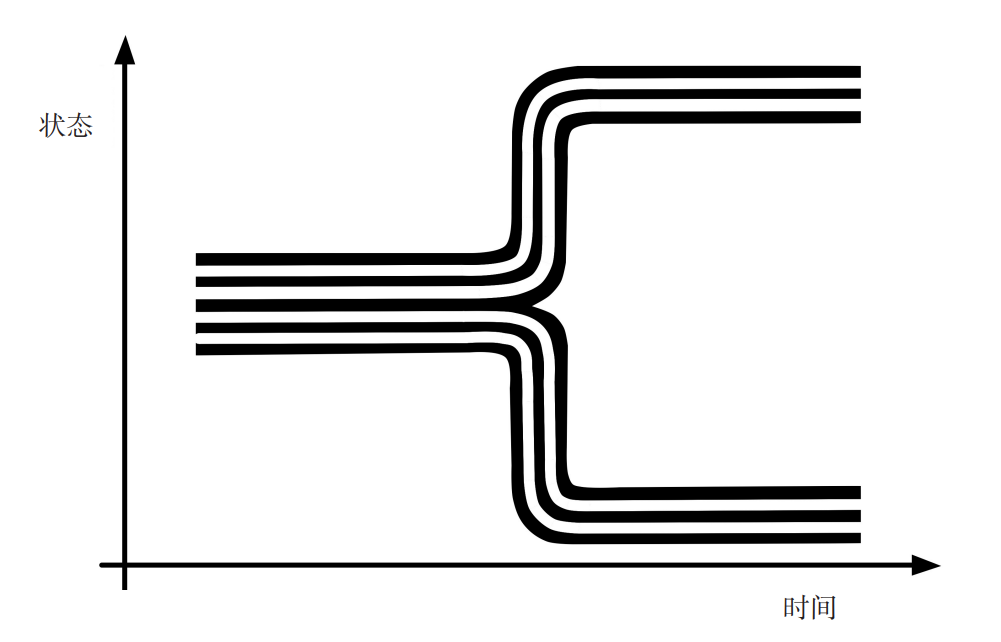 前面提到,涌现性质是指小尺度上的物理细节被抹平之后,出现在大尺度上的近似描述。图 2说明了如何利用这一点为自由意志腾出地方。在微观层面上,路径(白色线条)是由初始状态决定的,也就是说,图片的左侧是起始位置。但是在宏观层面上,如果你忘记了初始条件的确切情况,那么只看所有微观路径的集合,就能发现宏观路径(黑色轮廓)出现了分岔。
