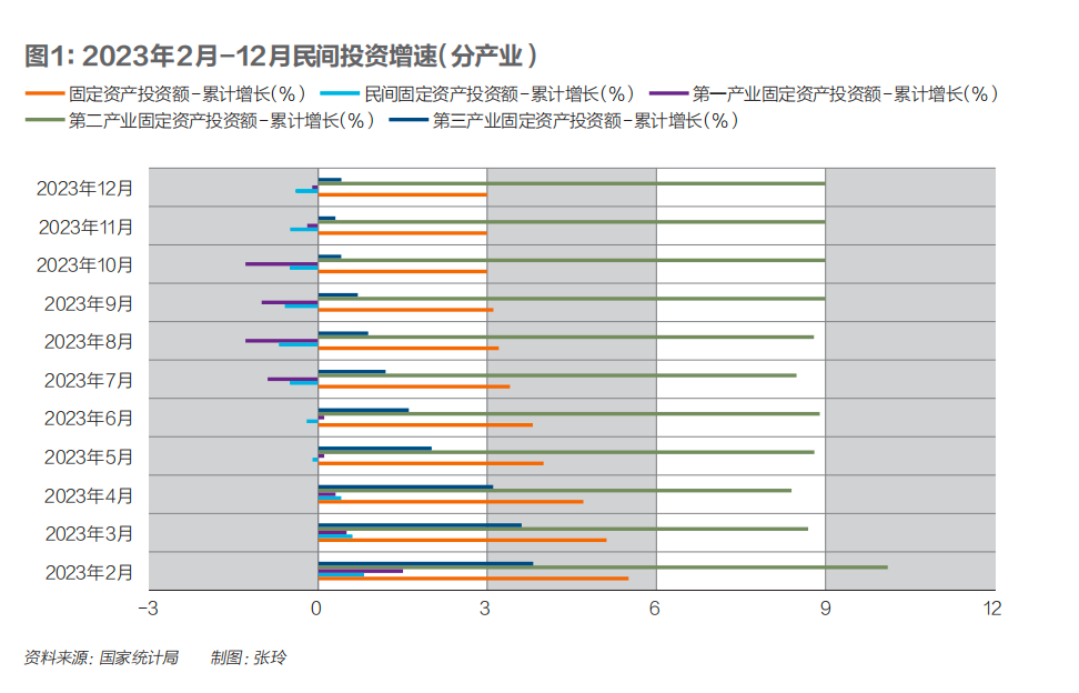 中国首席经济学家论坛理事、平安证券首席经济学家钟正生等认为,房地产投资回落是民间投资下滑的主要原因。2022年以来,中国房地产市场出现深度调整,房地产开发投资完成额累计同比增速由2022年初的3.7%一路下滑至11月的-9.8%,且尚未出现见底迹象。根据计算,房地产业投资在民间第三产业投资中的占比超过60%。因此,民间第三产业投资增速的变化在很大程度上反映了民间房地产开发投资(或民营房企)状况。民间第三产业投资增速持续下滑至负区间,与民间第二产业投资情况形成了鲜明的对比,表明房地产开发投资的萎缩是拖累民间投资的主要因素。