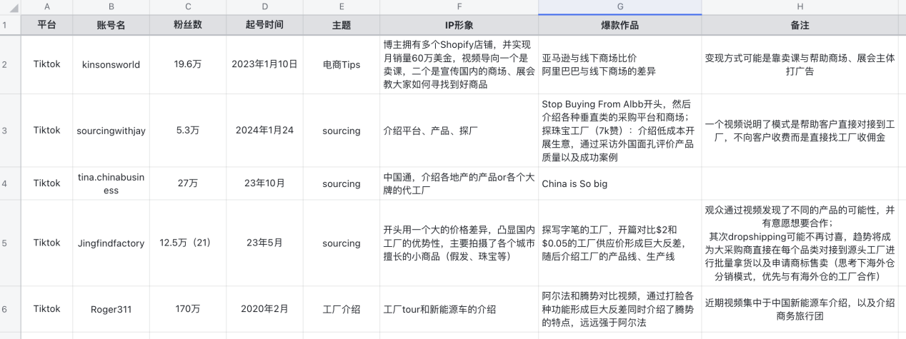 唐文卿已经找了些对标账号,还做了简单的分析。在TikTok上,有五六个中国人做的探厂账号,帮助国外客户在中国寻找供应链。评论区里,很多不同的国家的经销商在询盘。