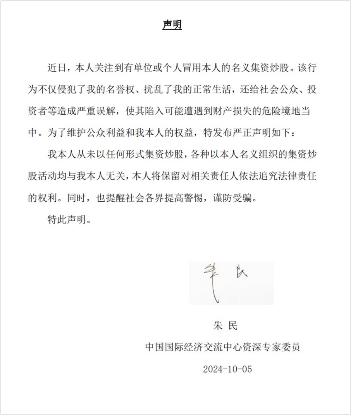 近日,中国国际经济交流中心资深专家委员朱民发布声明称,从未以任何形式集资炒股,各种以其名义组织的集资炒股活动均与本人无关。