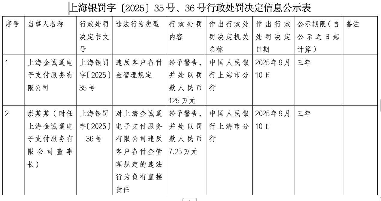 9月19日,中国人民银行上海市分行公布的行政处罚信息显示,上海金诚通电子支付服务有限公司因“违反客户备付金管理规定”,被中国人民银行上海市分行给予警告,并处以罚款125万元。