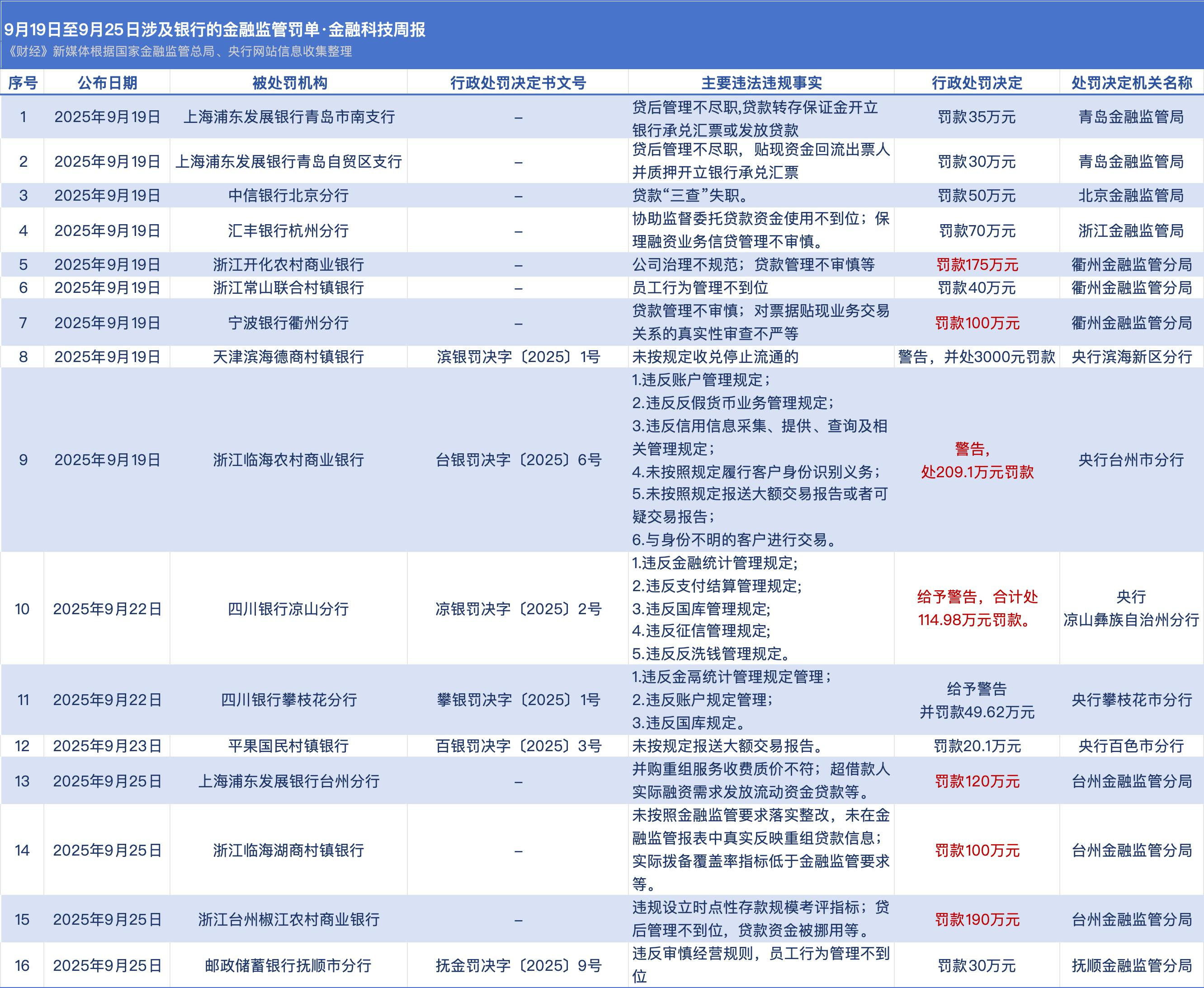 浦发银行连收3张罚单;浙江临海农商行被罚209.1万元