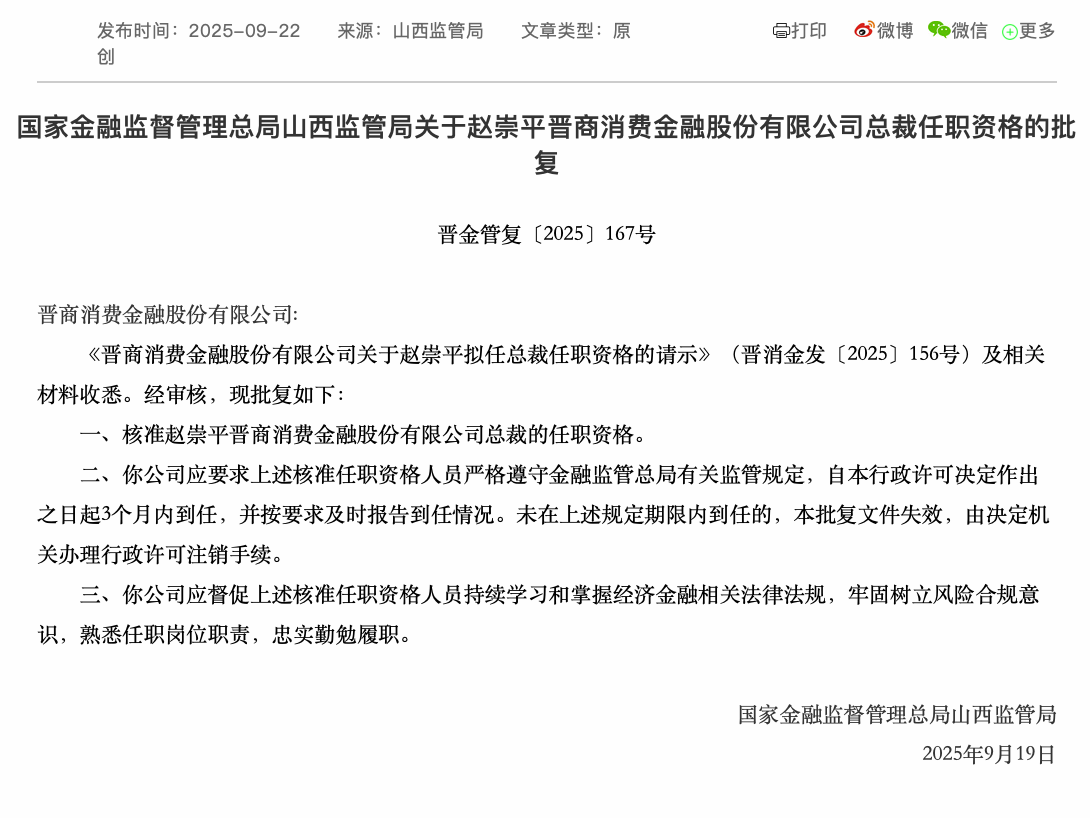 9月22日,国家金融监督管理总局官网显示,山西金融监管局核准赵崇平晋商消费金融股份有限公司总裁的任职资格。