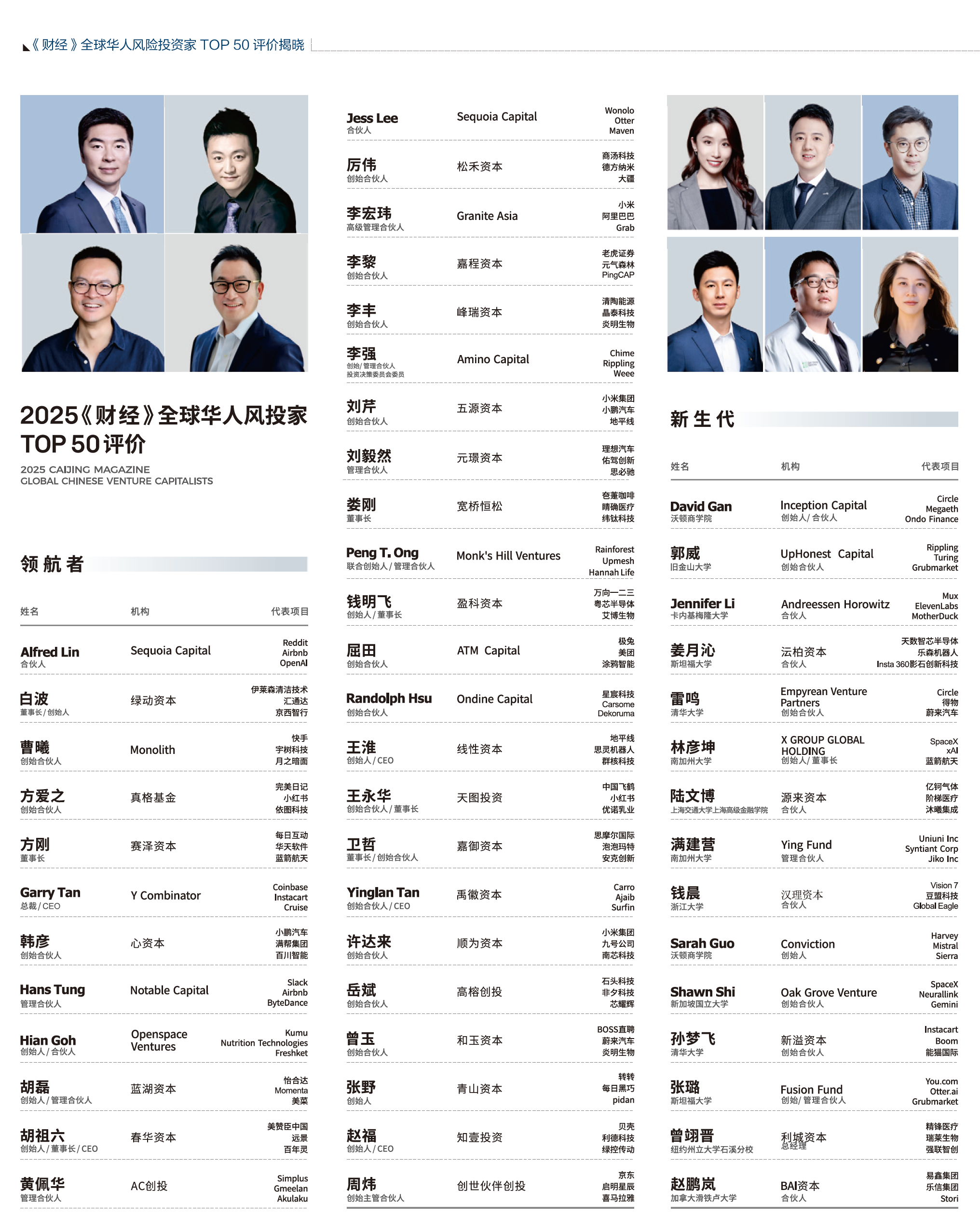作为始终关注全球产融联动的权威媒体平台,《财经》持续见证全球创新资本格局的深刻变革。为记录这些变革背后的关键力量,《财经》发起“《财经》全球华人风险投资家&CVC系列评价”,致力构建全球一级市场投资领域的价值坐标。其中《财经》全球华人风投家TOP50评价聚焦在全球主要风险投资市场持续创造超额回报,以前瞻性布局推动技术变革与产业创新的华人投资领袖。