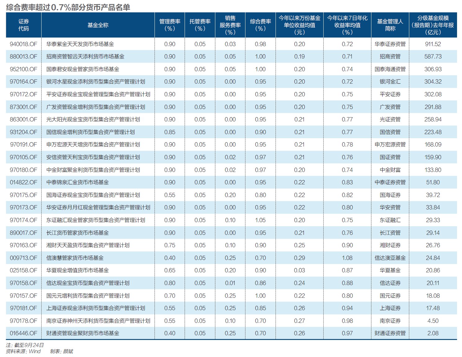 在货基收益率普遍仅有1%的当下,高费率对投资者收益的侵蚀愈发显著。《财经》根据Wind(万得)数据统计,截至9月24日,今年以来,全市场货币基金7日年化收益率均值为1.35%,而综合费率超过0.7%的货币产品7日年化收益率为0.81%,仅有全市场平均水平的六成左右。这些高费率产品中,大多数产品7日年化收益率已经低于综合费率,也就是说,投资者支付的费用比到手的收益还要高。