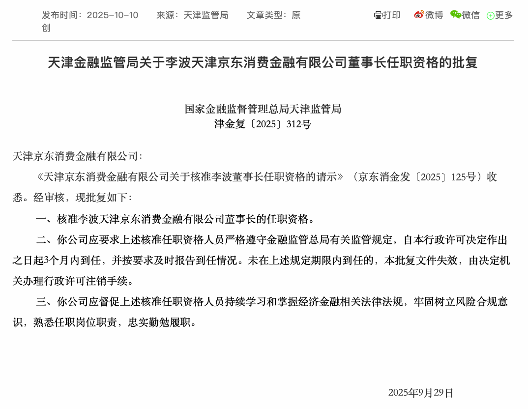 10月10日,国家金融监督管理总局官网显示,天津金融监管局核准李波天津京东消费金融有限公司董事长的任职资格。