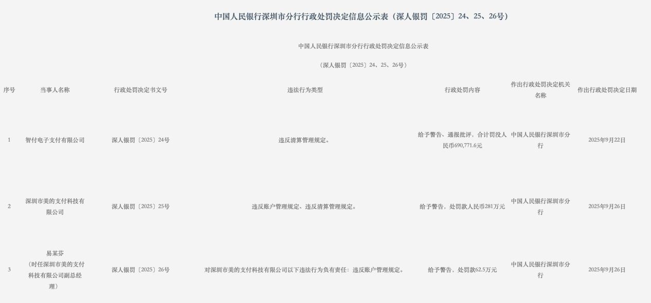 美的支付、智付电子支付被央行深圳市分行处罚