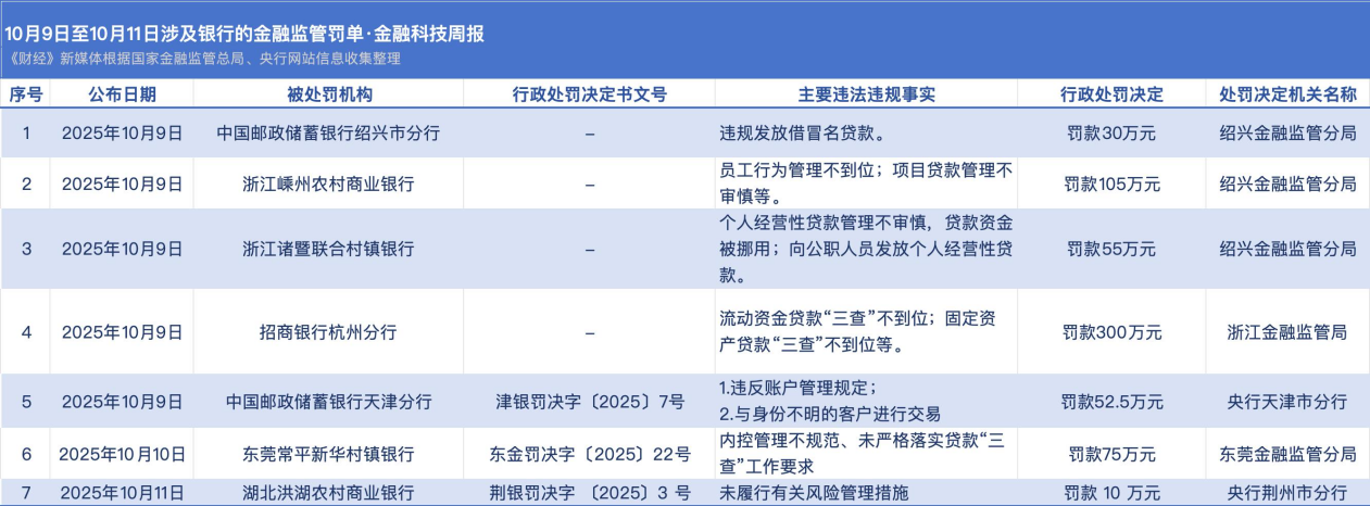 10月9日至10月11日,央行、国家金融监督管理总局官网披露7张涉及银行的罚单。其中,被罚金额最大的是招商银行杭州分行,其因“流动资金贷款‘三查’不到位;固定资产贷款‘三查’不到位等”被浙江金融监管局罚款300万元。