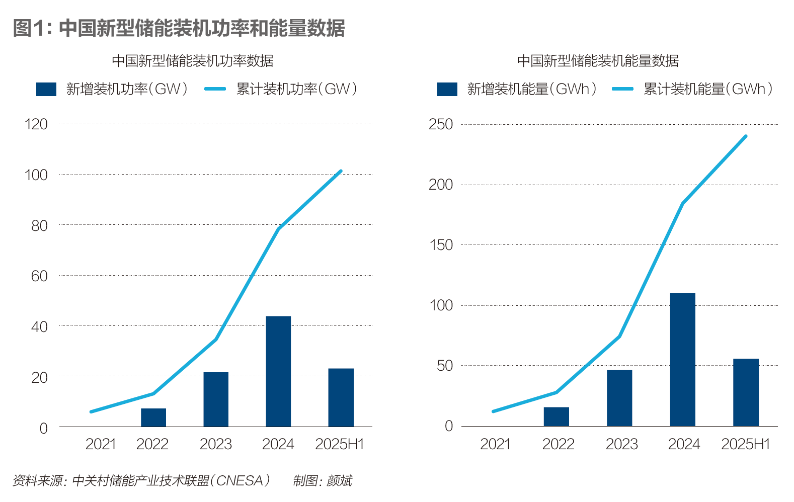 据新能源行业资讯机构InfoLink统计,2025年上半年,全球储能电芯出货量达240.2GWh,同比增长106.1%。根据中关村储能产业技术联盟(CNESA)的数据,2025年上半年,中国新型储能新增投运规模达到23.03GW/56.12GWh(功率/能量),两个指标同比增长均超过68%,累计装机功率和能量分别突破100GW和240GWh。
