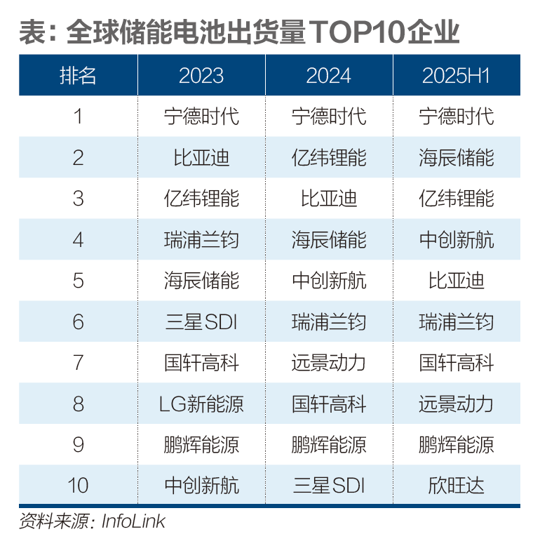 回看2023年全球储能电池的出货量榜单,前十名尚有两家韩国企业,即三星SDI和LG新能源,到2024年仅剩三星SDI一家。而截至2025年上半年,前十名已全部为中国公司,合计市场占有率高达91.2%。