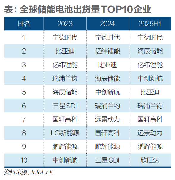 回看2023年全球储能电池的出货量榜单,前十名尚有两家韩国企业,即三星SDI和LG新能源,到2024年仅剩三星SDI一家。而截至2025年上半年,前十名已全部为中国公司,合计市场占有率高达91.2%。