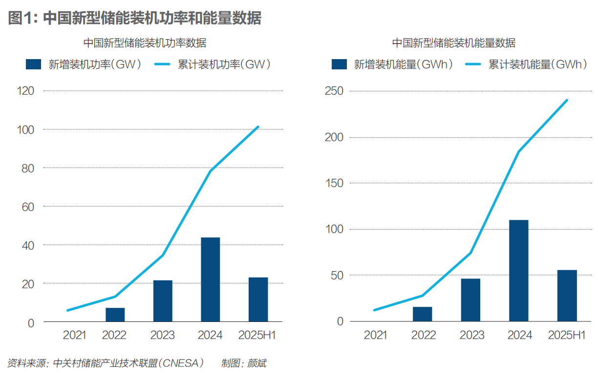 据新能源行业资讯机构InfoLink统计,2025年上半年,全球储能电芯出货量达240.2GWh,同比增长106.1%。根据中关村储能产业技术联盟(CNESA)的数据,2025年上半年,中国新型储能新增投运规模达到23.03GW/56.12GWh(功率/能量),两个指标同比增长均超过68%,累计装机功率和能量分别突破100GW和240GWh。