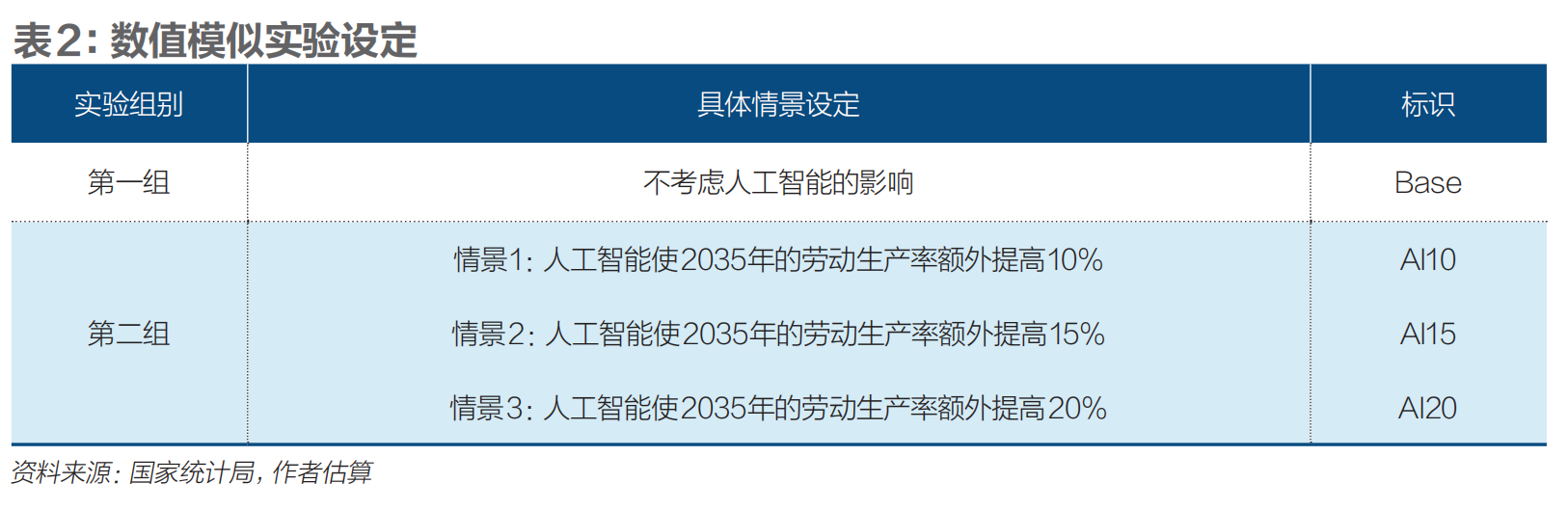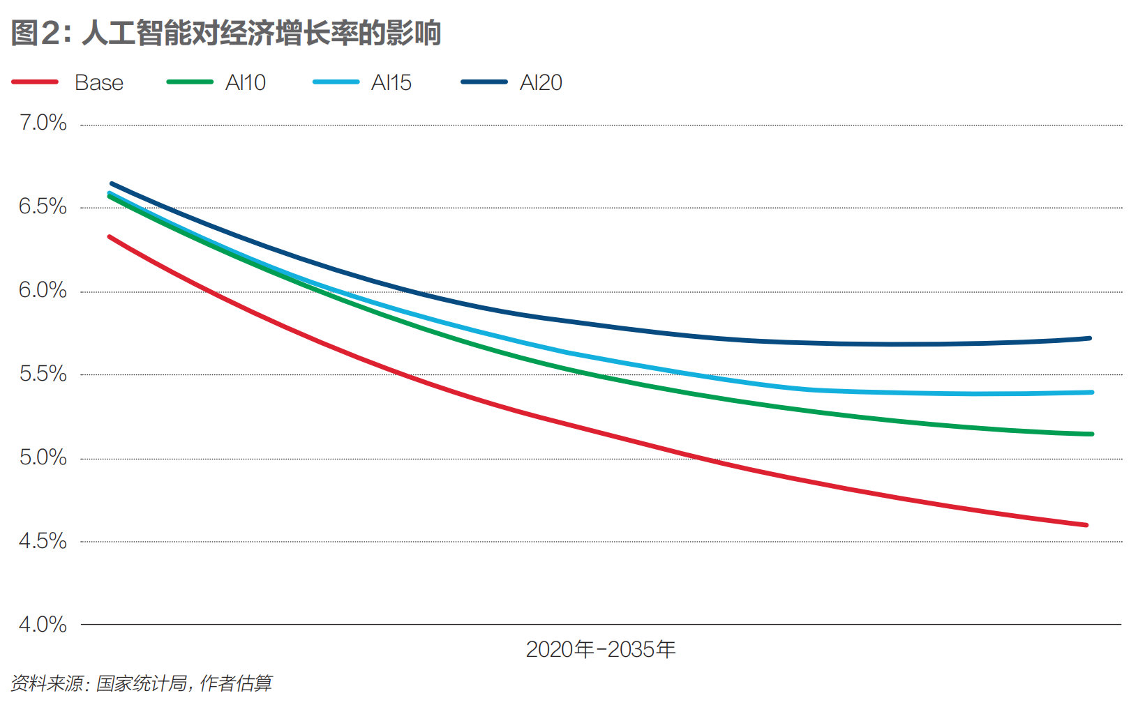 我们发现,由于基准模型没有考虑老龄化的影响,测算得出的潜在增速与现实比可能偏高,但仍可以发现,没有人工智能的促进作用时,潜在增速在未来10年下滑的速度较快。人工智能的发展,即便我们采用非常保守的假设影响下,其将显著提升技术进步和规模经济,使得潜在增速下降速度趋缓,且在一定时期保持较为稳定的发展。