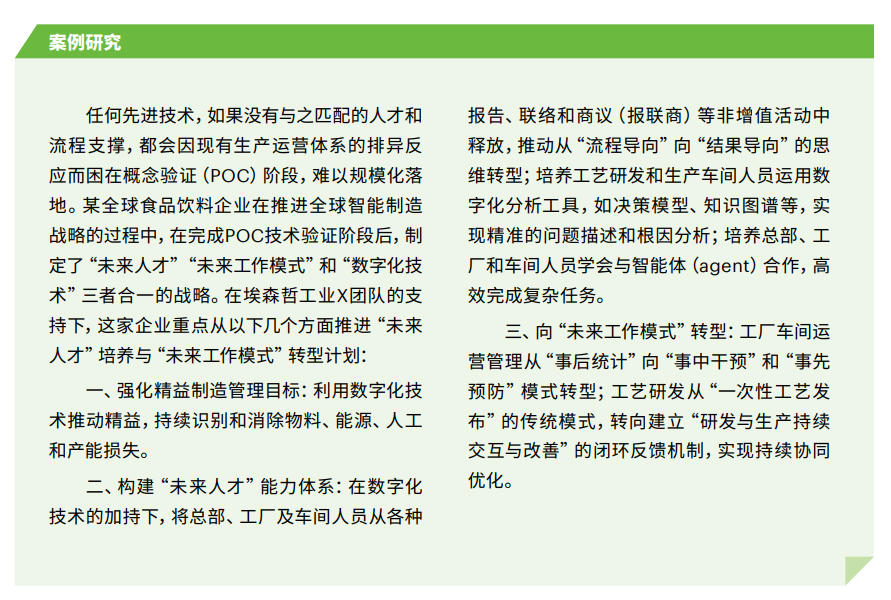 为此,企业急需为员工明确规划未来职业机遇,并提供相应的职业发展通道,同时还需建立新型人才发展模式,支持持续且实时的技能培训。未来的大部分工厂职工将从直接生产转向间接生产,这意味着他们将从体力劳动转向流程监管、决策和优化等职能。随着工作性质的演变,这些人还需要融入一个人机互动与共进的循环,既要向AI学习、与AI共同进步,也要训练AI。他们需要适应与AI协作、操作自主系统及监督复杂的自动化流程的工作常态。