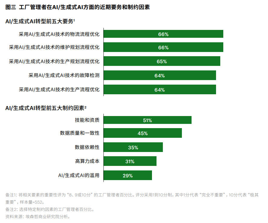 高达62%的受访工厂管理者认为,AI是推进工厂运营全方位发展的关键因素。然而在短期内,多数管理者优先考虑的是维护、修理和大修(MRO)流程、物流优化及生产效率提升(见图三)。这种思路不无道理,但前提是企业只需确保工厂在未来几年繁荣发展。