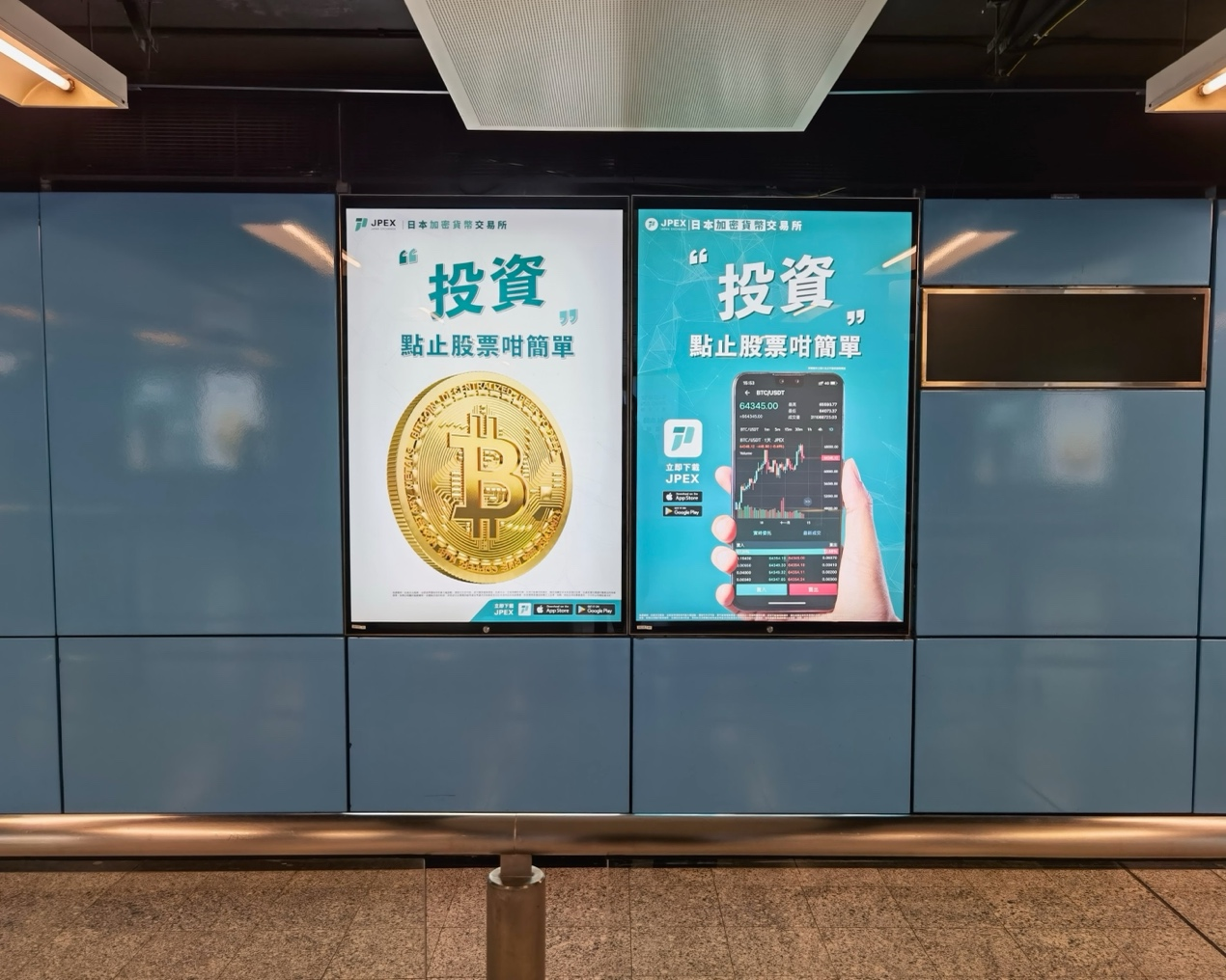 JPEX案是中国香港“近年来涉及受害人数最多、损失金额最庞大的骗案”。除声称低风险高回报,该平台也采取了在公开场合大量宣传的方式吸引投资者。图为2021年其在某交通设施内的广告。摄/焦建