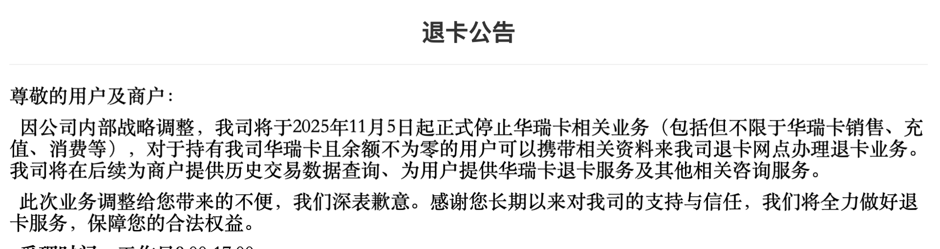 11月5日,北京华瑞富达支付科技有限公司发布公告,宣布将于2025年11月5日起正式停止华瑞卡相关业务。公告显示,因公司内部战略调整,华瑞卡包括销售、充值、消费等在内的相关业务将被停止。对于持有华瑞卡且卡内余额不为零的用户,公司表示可携带相关资料前往退卡网点办理退卡业务。据悉,北京华瑞富达支付科技有限公司是快手于2024年通过股权变更取得的支付牌照主体。