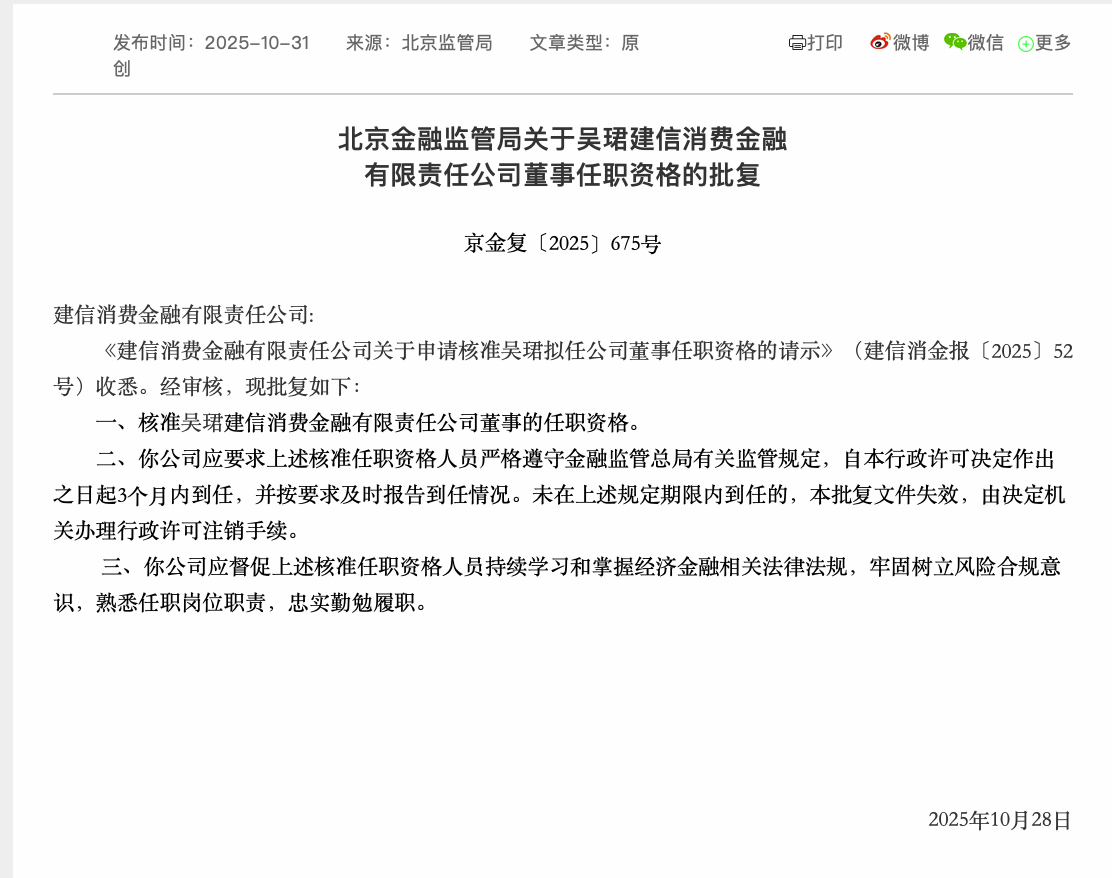 10月31日,国家金融监督管理总局官网披露,北京金融监管局核准吴珺建信消费金融有限责任公司董事的任职资格。