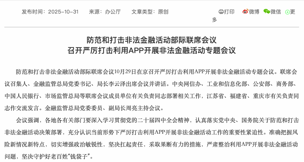 10月31日,国家金融监督管理总局官网显示,防范和打击非法金融活动部际联席会议10月29日在京召开严厉打击利用APP开展非法金融活动专题会议。