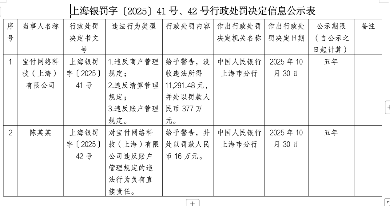 10月31日,中国人民银行上海市分行行政处罚决定信息公示表披露,宝付网络科技(上海)有限公司因“违反商户管理规定、违反清算管理规定以及违反账户管理规定”被中国人民银行上海市分行给予警告,没收违法所得11291.48元,并处以罚款人民币377万元。相关责任人陈某某被给予警告,并罚款16万元。
