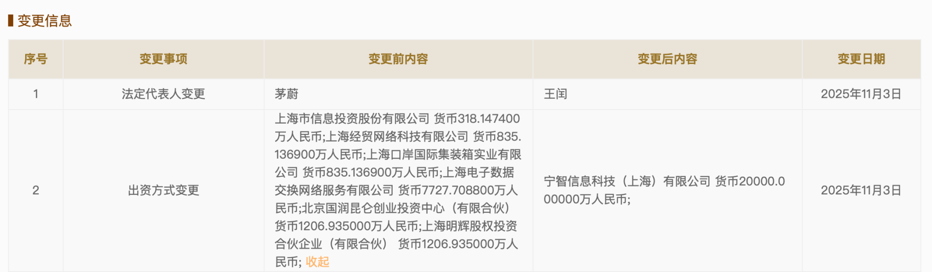 国家企业信用信息公示系统显示,11月3日,东方电子支付有限公司完成重大股权变更,原6家股东全部退出,宁智信息科技(上海)有限公司成为其唯一控股股东。据悉,宁智信息科技由小红书科技有限公司全资持股。