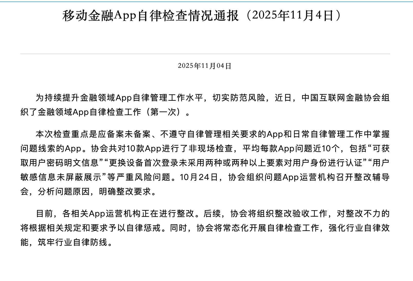 11月4日,中互金协会通报移动金融App自律检查(第一次)情况。