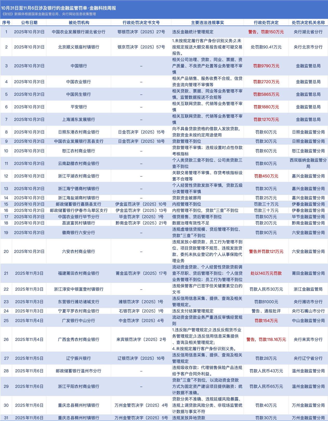 10月31日至11月6日,央行、国家金融监督管理总局官网共披露31张涉及银行的罚单。其中,有5张罚款金额达到千万级:中国银行因“相关公司治理、贷款、同业、票据、资产质量、不良资产处置等业务管理不审慎”被金融监管总局罚款9790万元;农业银行因“相关产品销售、服务收费不合规,信贷资金流向管理不审慎等”被金融监管总局罚款2720万元;民生银行股份因“相关贷款、票据、同业等业务管理不审慎,监管数据报送不合规等”被金融监管总局罚款5865万元;平安银行因“相关互联网贷款、代销等业务管理不审慎”被金融监管总局罚款1880万元;上海浦东发展银行因“相关互联网贷款、代销等业务管理不审慎”被金融监管总局罚款1270万元。
