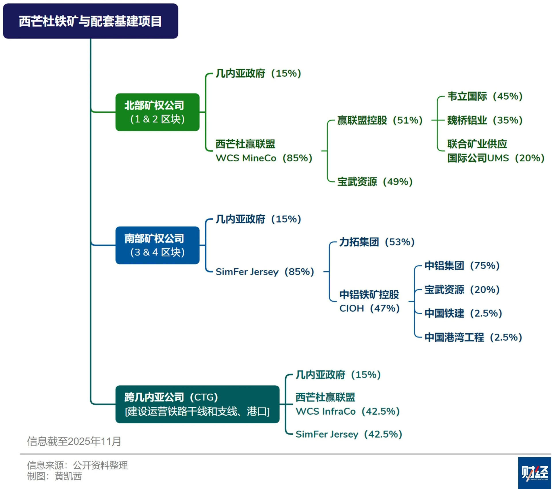 北部矿区(1号、2号区块)由西芒杜赢联盟(Winning Consortium Simandou,WCS)主导开发。该主体由新加坡韦立国际集团(Winning International Group)牵头,其他股东方包括中国宝武资源、山东魏桥铝业及联合矿业供应国际公司(UMS),合计持股85%。项目进入运营期后,宝武资源拥有将股比增加至51%的选择权,主导矿山开发。