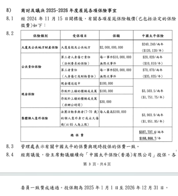 宏福苑业主立案法团网站文件显示,宏福苑业主立案法团曾商讨及议决2025-2026年度屋苑各项保险事宜,经商议后,动议继续向“中国太平保险(香港)有限公司”(下称“太平香港”)投保,各委员一致赞成通过,投保期为2025年1月1日至2026年12月31日。