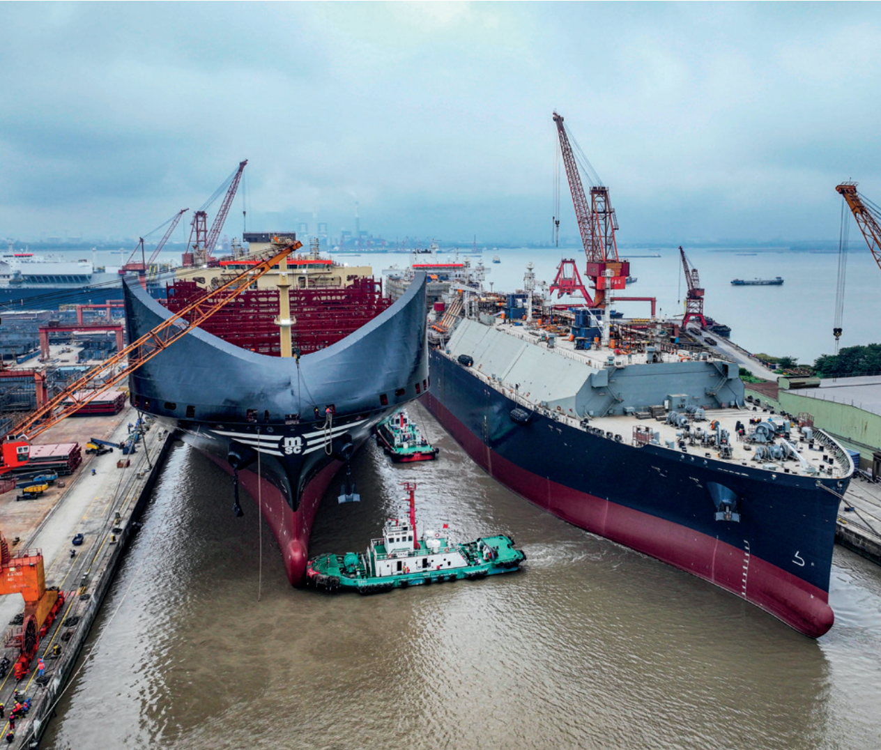 位于江苏省泰兴市的江苏扬子鑫福造船有限公司船坞内建造的大型船舶。图/新华