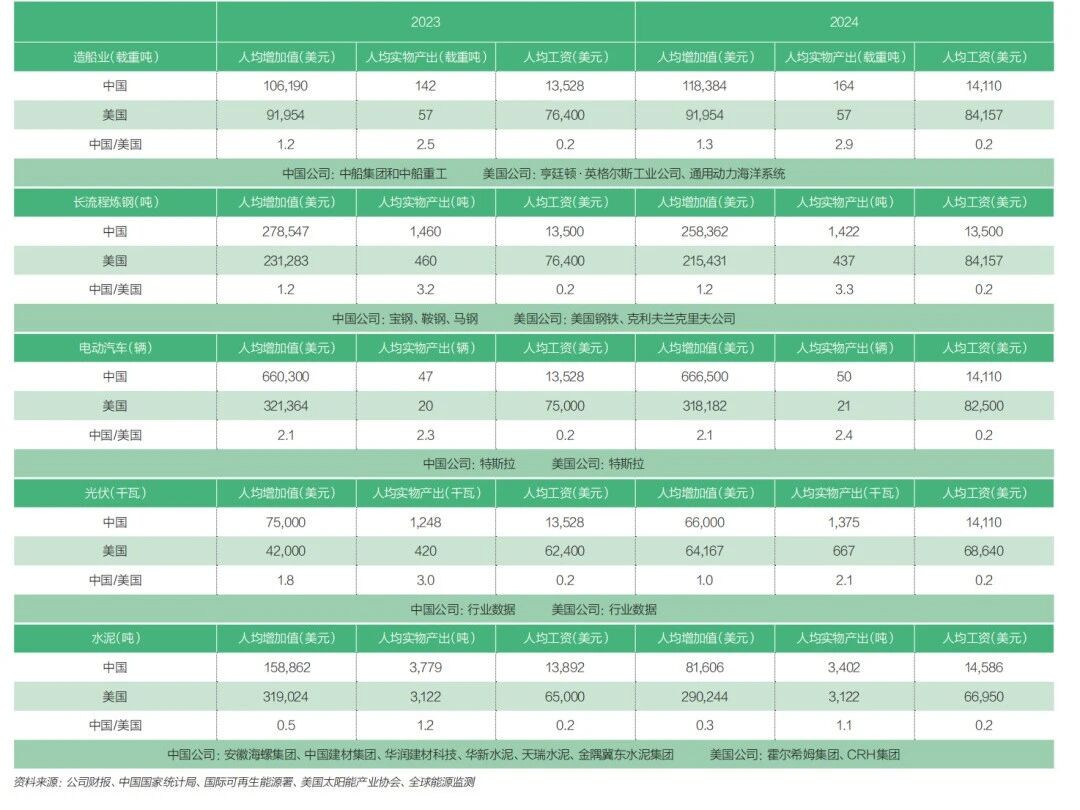 笔者的研究聚焦于五大重要行业,比较中美两国劳动生产率的差别,包括造船、综合炼钢、电动汽车、太阳能光伏组件和水泥。在这些行业中,太阳能光伏使用的是行业数据;对于造船、炼钢和水泥行业,我们采用两国主要上市公司披露的数据;而电动车数据来自特斯拉的披露,该公司在上海和美国加州生产相同的车型,因此数据可比。